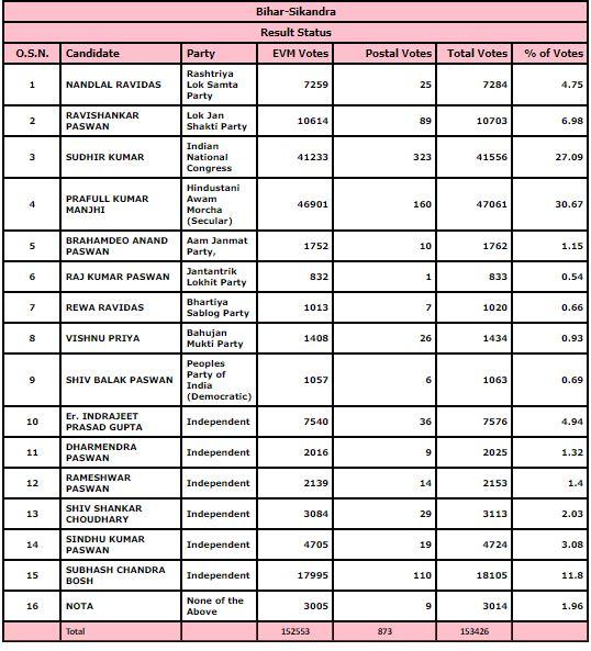 इस सीट पर हम के प्रफुल्ल कुमार मांझी को 47061 वोट मिले, जबकि कांग्रेस के सुधीर कुमार को 41556 वोट मिले हैं. सिकंदरा विधानसभा सीट पर पहले चरण में मतदान हुआ था. इस दौरान 52.82 फीसदी लोगों ने वोट डाले थे.