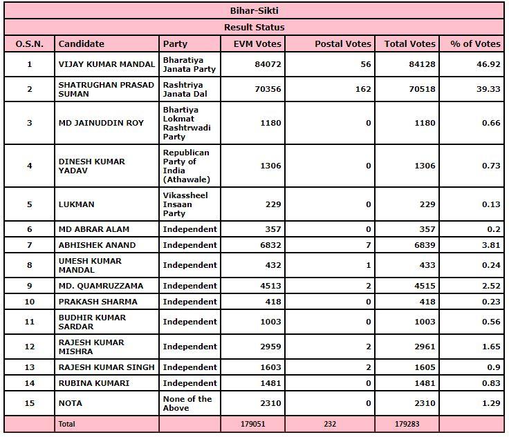 बिहार विधानसभा की सभी 243 सीटों पर मतगणना देर रात तक खत्म हुई. सिकटी सीट पर सीधी लड़ाई विजय कुमार मंडल (BJP) और डॉक्टर शत्रुघ्न मंडल (RJD) के बीच रही. इस अहम मुकाबले में बीजेपी के विजय कुमार मंंडल ने बाजी मारी. यहां तीसरे चरण के तहत 7 नवंबर को 53.6% वोटिंग हुई थी. सिकटी से 14 उम्मीदवार मैदान में थे.