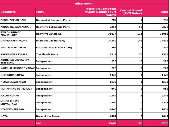 इस बार सिवार विधानसभा सीट पर 3 नवंबर 2020 को मतदान हुआ. इस सीट पर बीजेपी की ओर से ओम प्रकाश यादव और आरजेडी की ओर से अवध बिहारी चौधरी को टिकट मिली. वहीं व्यासदेव प्रसाद निर्दलीय चुनाव लड़ रहे. यहां 54.12 फीसदी वोट डाले गए. सिवान से आरजेडी के अवध बिहारी को 76052 वोट हासिल हुए. वहीं बीजेपी के ओम प्रकाश यादव को 74491 वोट मिले. इसके अलावा निर्दलीय चुनाव लड़ रहे व्यासदेव प्रसाद को 1846 वोट हासिल हुए हैं.