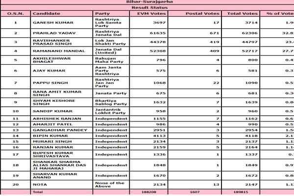 बिहार की सूर्यगढ़ा विधानसभा सीट पर आरजेडी के प्रह्लाद यादव को जीत मिली है. उन्होंने जेडीयू के रामानंद मंडल को शिकस्त दी. प्रह्लाद यादव को 10 हजार से ज्यादा वोटों से जीत मिली. चुनाव आयोग के आंकड़े के मुताबिक, प्रह्लाद यादव को 62306 वोट मिले. वहीं रामानंद मंडल के खाते में 52717 वोट पड़े. सूर्यगढ़ा विधानसभा सीट पर 19 उम्मीदवार मैदान में थे.