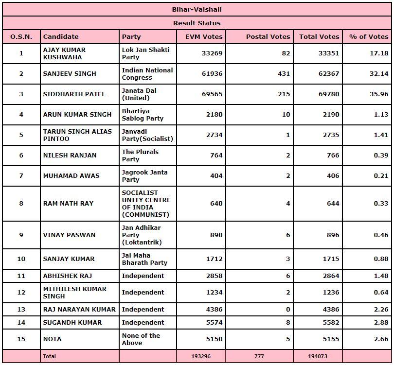 बिहार की वैशाली विधानसभा सीट पर इस बार 3 नवंबर को वोट डाले गए, यहां कुल 58.78% मतदान हुआ.