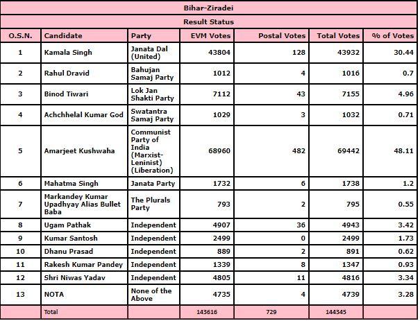 साल 2015 के विधानसभा चुनाव में जीरादेई विधानसभा सीट से जेडीयू के रमेश सिंह कुशवाहा ने 6091 वोटों से जीत हासिल की थी. रमेश सिंह कुशवाहा ने बीजेपी की आशा देवी को हराया था. वहीं इस सीट पर तीसरे नंबर पर सीपीआई (एमएलएल) की टिकट पर चुनाव लड़ रहे अमरजीत कुशवाहा ने भी कड़ी टक्कर दी थी.