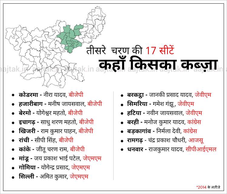 झारखंड विधानसभा चुनाव में तीसरे चरण की 17 सीटों पर वोटिंग जारी है. इस चरण में 309 उम्मीदवार चुनावी मैदान में हैं. इस चरण में बीजेपी, महागठबंधन, आजसू और जेवीएम के कई हाई प्रोफाइल नेताओं की साख दांव पर लगी है. इनमें पूर्व मुख्यमंत्री बाबूलाल मरांडी और आजसू सुप्रीमो पूर्व उपमुख्यमंत्री सुदेश महतो के लिए अग्निपरीक्षा है तो रघुवर सरकार के मंत्री नीरा यादव और सीपी सिंह के सामने सियासी जंग फतह करने की चुनौती है.