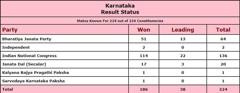 कर्नाटक में कांग्रेस सेंचुरी लगा चुकी है. वह 101 सीट जीत चुकी है. वहीं 35 सीटों पर आगे चल रही है. दूसरे नंबर पर भारतीय जनता पार्टी है. उसने 48 सीटें अबतक जीती हैं. वहीं 16 पर पार्टी आगे है. तीसरे नंबर पर क्षेत्रीय पार्टी जनता दल सेक्यूलर (JDS) है, उसे अबतक 16 सीट मिली हैं.