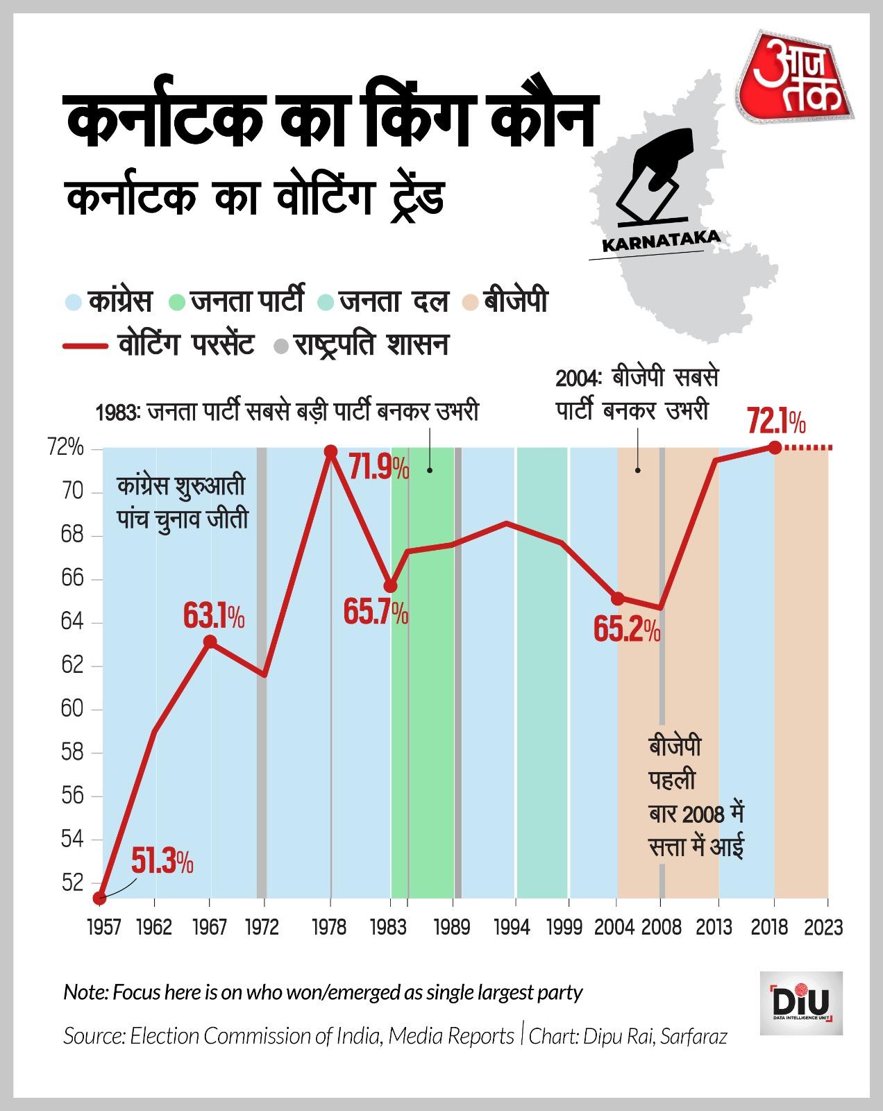 कर्नाटक में अब तक कुल 14 विधानसभा चुनाव हो चुके हैं. आठ चुनावों में वोटिंग परसेंटेज में इजाफा हुआ, जिसमें सिर्फ एक बार 1962 में कांग्रेस की सत्ता में वापसी हुई है. वहीं, पांच चुनावों में वोट प्रतिशत कम रहा जिसमें बीजेपी एक बार सत्ता में लौटी है.