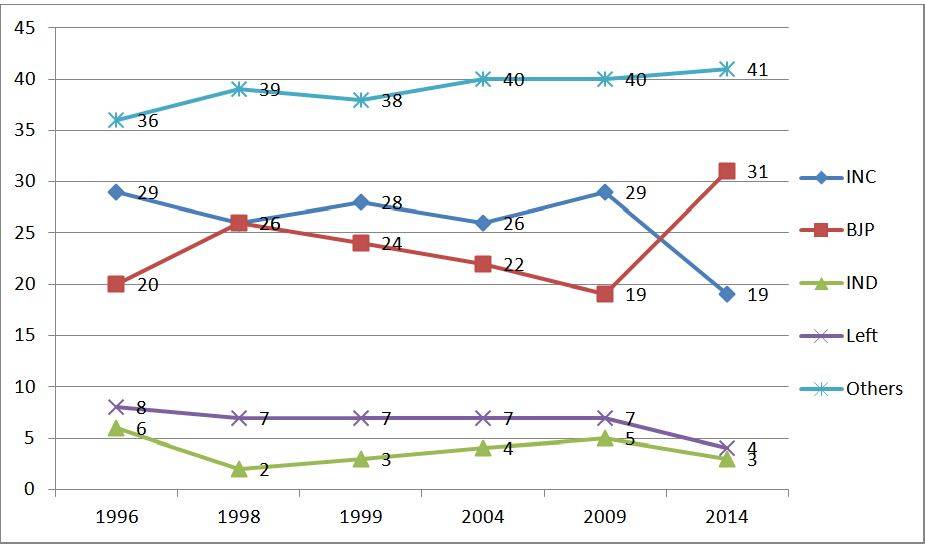 अगर पार्टी के वोट के अलावा 1996 से लेकर 2014 के चुनाव में क्षेत्रीय और छोटी पार्टियों को मिले कुल सीट को भी देखें तो लगभग यही नजारा देखने को मिलता है.
