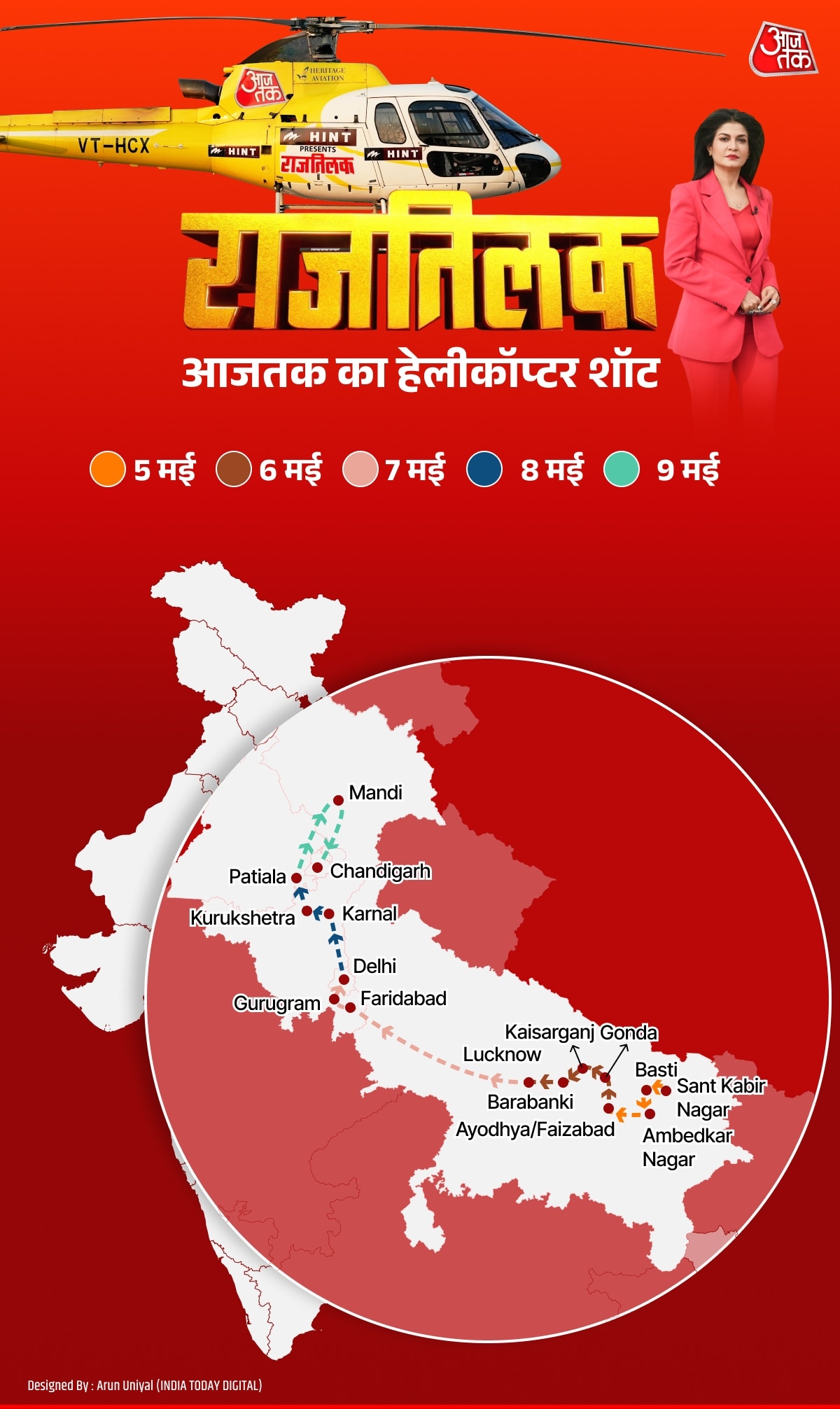 आजतक ने इस बार 'राजतिलक' को न्यूजरूम वाली पारंपरिक कवरेज से हटकर नए अंदाज में लॉन्च किया है. इसमें आजतक की तेज-तर्रार एंकर अंजना ओम कश्यप हेलिकॉप्टर के जरिए चुनावी शो कर रही हैं. अपनी यात्रा में वह देश के करीब 100 शहरों को कवर करेंगी.