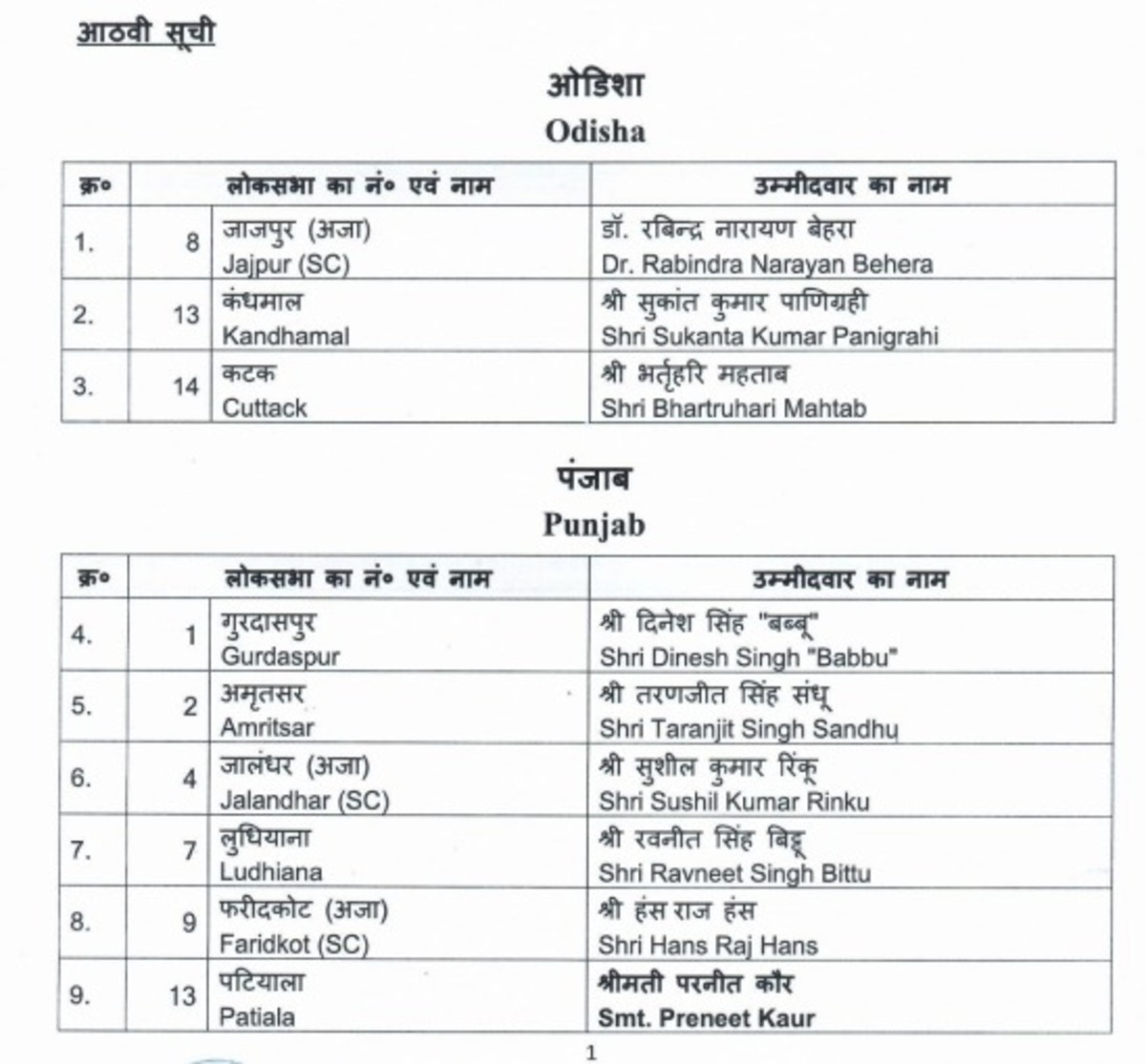 भारतीय जनता पार्टी ने लोकसभा चुनाव को लेकर आठवीं लिस्ट जारी कर दी है. बीजेपी ने पंजाब की 6, ओडिशा की 3 और पश्चिम बंगाल की 2 सीटों पर अपने उम्मीदवारों का ऐलान कर दिया है. सबसे पहले बात पंजाब की करें तो गुरदासपुर लोकसभा सीट से बीजेपी ने सनी देओल का पत्ता काट दिया है. उनकी जगह दिनेश सिंह 'बब्बू' को टिकट दिया गया है. जबकि अमृतसर सीट से तरणजीत सिंह संधू पर बीजेपी ने भरोसा जताया है. उधर, पार्टी ने पटियाला लोकसभा सीट से परनीत कौर को चुनावी मैदान में उतारा है. परनीत कौर कैप्टन अमरिंदर सिंह की पत्नी हैं.