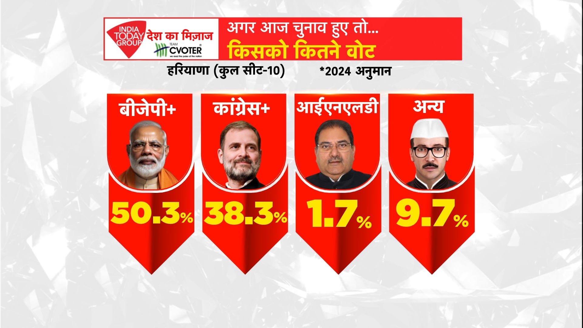 इंडिया टुडे-सी वोटर के सर्वे के अनुसार, हरियाणा में बीजेपी को 50.3 फीसद शेयर के साथ पहले स्थान पर है और 38.3 फीसद वोट शेयर के साथ दूसरे स्थान पर है. जबकि आईएनएलडी 1.7 फीसद वोट शेयर के साथ तीसरे पायदान पर है. साथ ही 9.7 फीसद वोट शेयर के साथ अन्य के चौथे स्थान पर रहने के अनुमान है.
