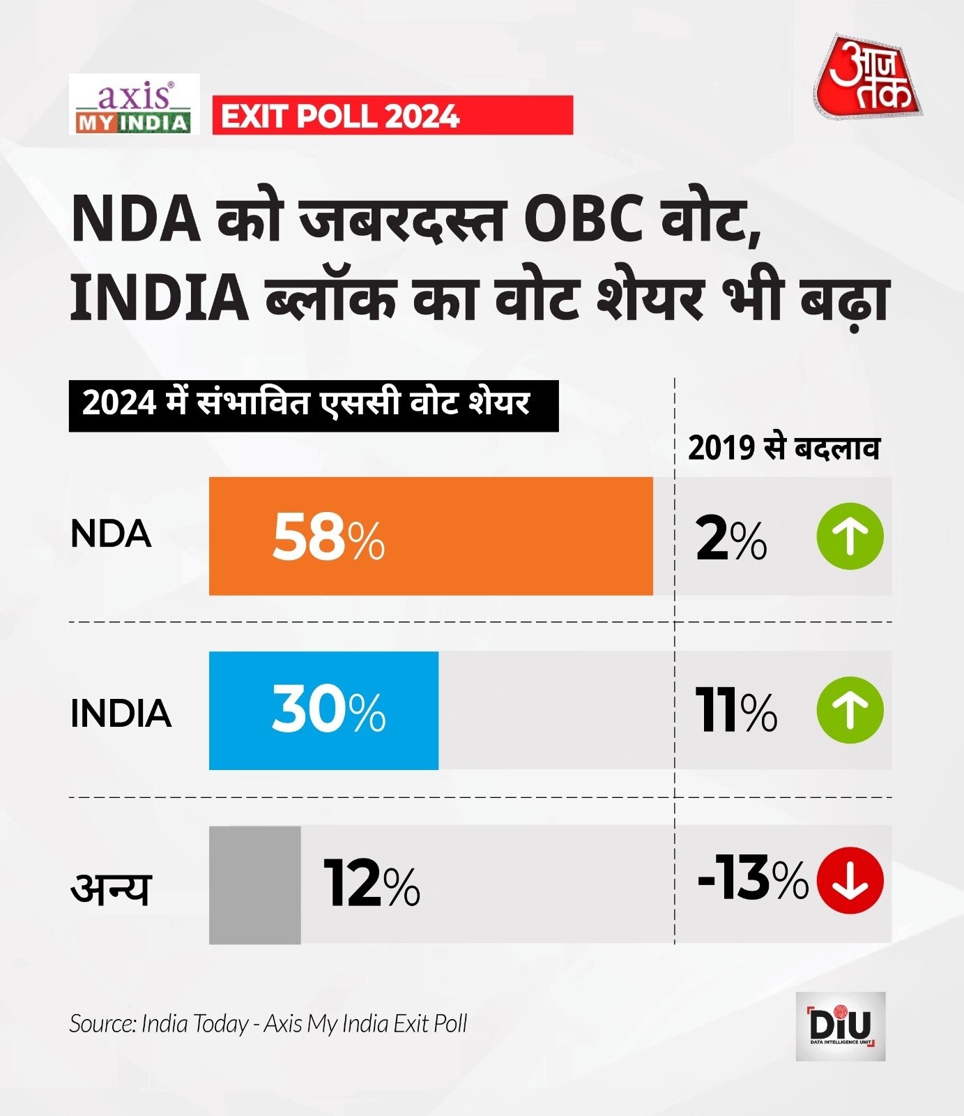 देश में हर तीसरे मतदाता में एक ओबीसी है. 2019 के लोकसभा चुनाव में 56 फीसदी ओबीसी वोटर्स ने एनडीए को वोट दिया था. 2024 के एग्जिट पोल से पता चलता है कि इस बार चुनाव में एनडीए को वोट देने वाले ओबीसी वोटर्स की संख्या बढ़कर 58 फीसदी हुई है.