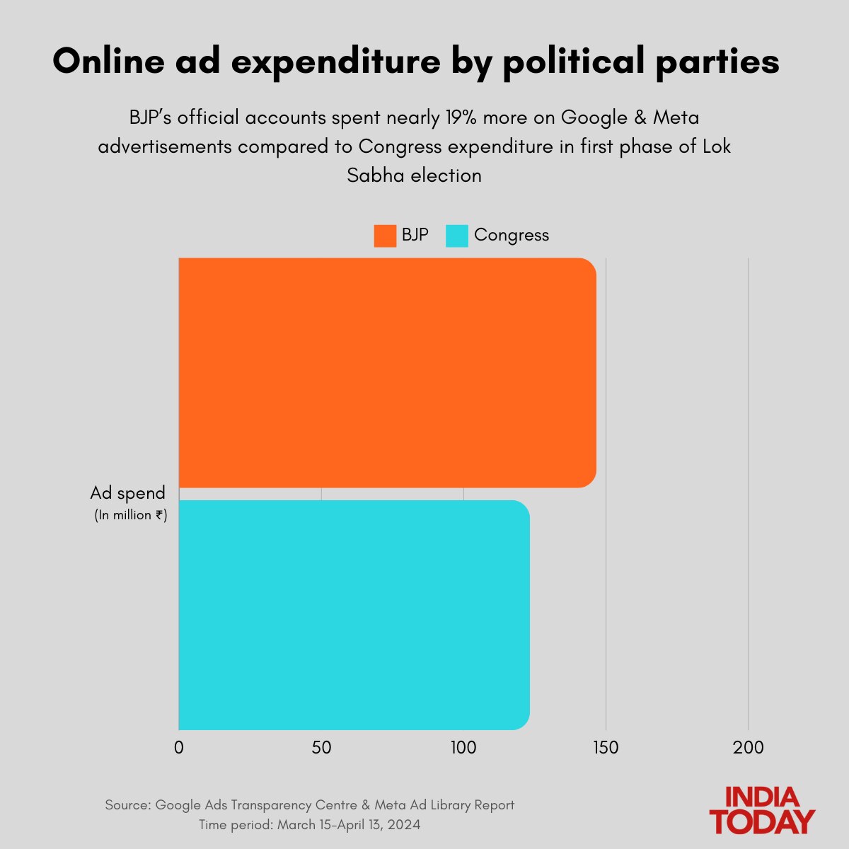 लोकसभा चुनाव के पहले चरण का मतदान खत्म हो गया है. पहले चरण के इस चुनाव के दौरान राजनीतिक दलों ने अपने चुनावी एजेंडे, नीतियों, घोषणापत्र और उपलब्धियों के प्रचार में 36.5 करोड़ रुपये खर्च किए हैं. पार्टियों ने अपने प्रचार-प्रसार के लिए गूगल और मेटा को प्रमुखता दी. इसके विश्लेषण से पता चलता है कि कांग्रेस ने सुस्त शुरुआत जरूर की लेकिन विज्ञापन खर्च के मामले में पार्टी बीजेपी से पीछे भी नहीं है.