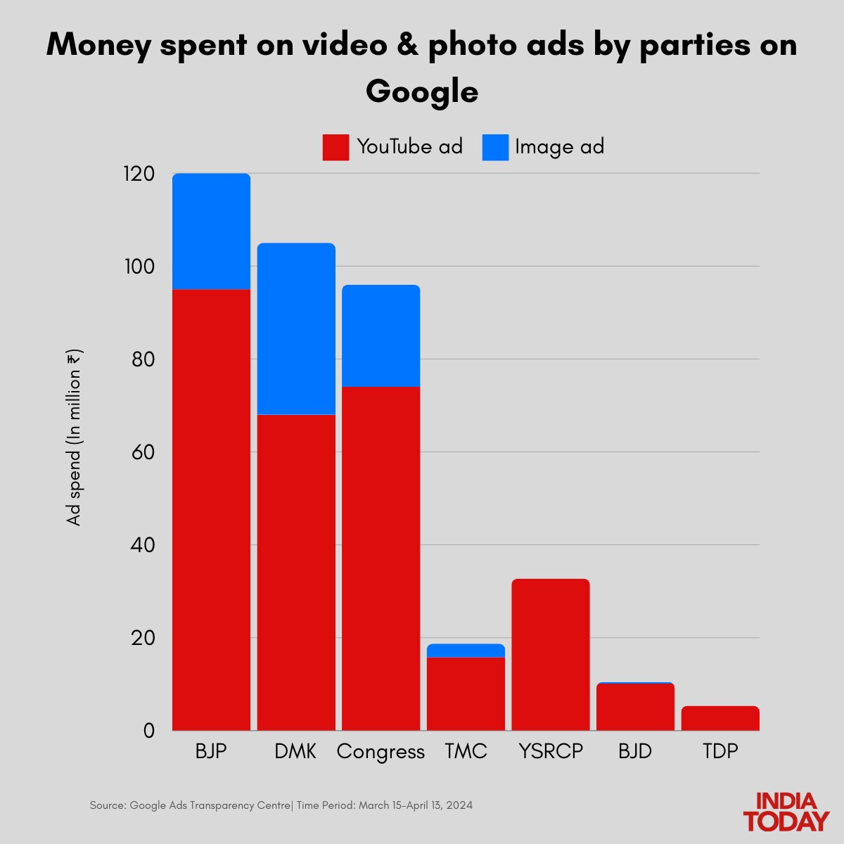 बीजेपी ने गूगल विज्ञापन पर 14.7 करोड़ रुपये खर्च किए, जबकि कांग्रेस ने 15 मार्च से 13 अप्रैल के बीच गूगल प्लेटफॉर्म पर 12.3 करोड़ रुपये अपने प्रचार में लगाए. कांग्रेस की ही सहयोगी डीएमके ने अपने गूगल विज्ञापन पर 12.1 करोड़ रुपये खर्चे हैं. बीजेपी की खासा पसंद गूगल रही है, जहां पार्टी ने कुल विज्ञापनों का 81 फीसदी हिस्सा खर्च किया है. वहीं कांग्रेस ने अपने विज्ञापन खर्च का 78 फीसदी गूगल पर खर्च किया है.