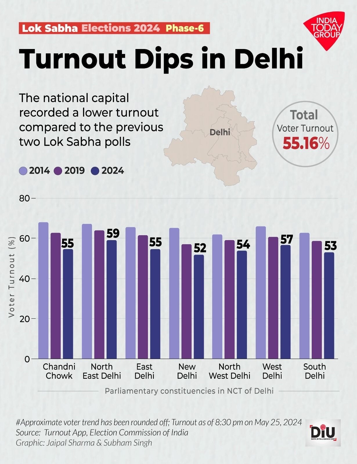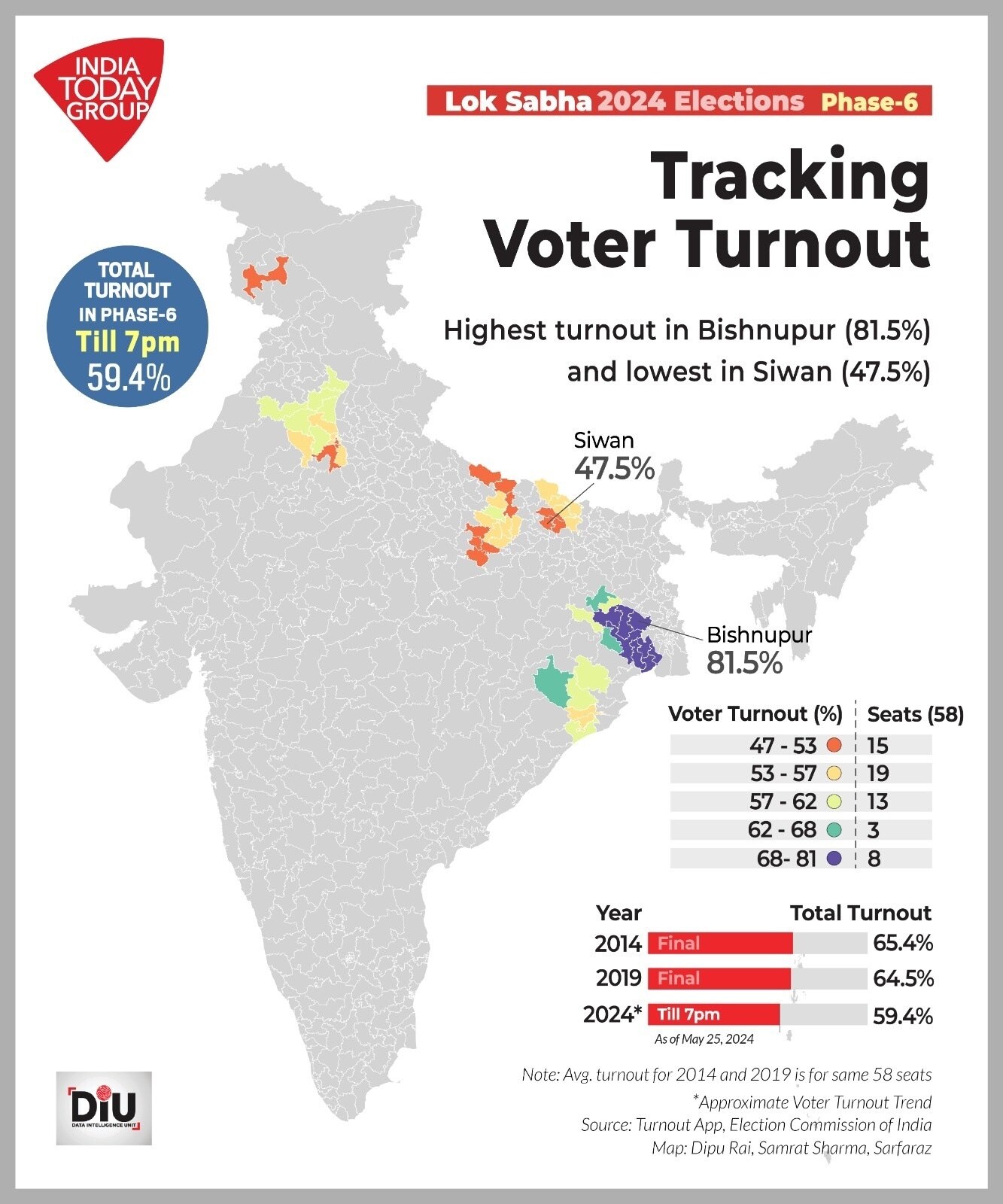 लोकसभा चुनाव के महासमर में आज छठे चरण के तहत 7 राज्यों और एक केंद्रशासित प्रदेश की 58 सीटों पर वोटिंग हुई. इन आठ राज्यों में बिहार, उत्तर प्रदेश, जम्मू कश्मीर, पश्विम बंगाल, झारखंड़, ओडिशा, हरियाणा और दिल्ली में वोट डाले गए. चुनाव आयोग के मुताबिक, छठे चरण में 58 सीटों पर शाम 07.45 बजे तक 59.06 फीसदी मतदान दर्ज किया गया.