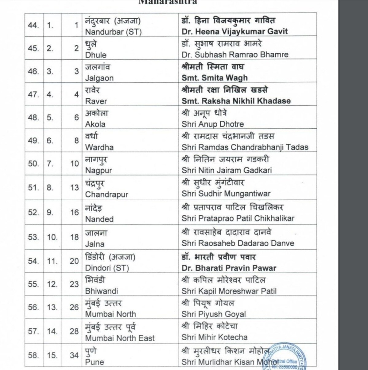 बीजेपी ने अपनी दूसरी लिस्ट में महाराष्ट्र की नागपुर सीट से नितिन जयराम गडकरी, मुंबई नॉर्थ से पीयूष गोयल, बीड से पंकजा मुंडे, नंदुरबार से हिना गावित, धुले से सुभाष रामराव भामरे, जलगांव से स्मिता बाघ, रावेर से रक्षा निखिल खडसे, अकोला सीट से अनूप धोत्रे, वर्धा से रामदास तडस, चंद्रपुर से सुधीर मुंगंटीवार, नांदेड़ से प्रतापराव पाटिल पर बीजेपी ने भरोसा जताया है.