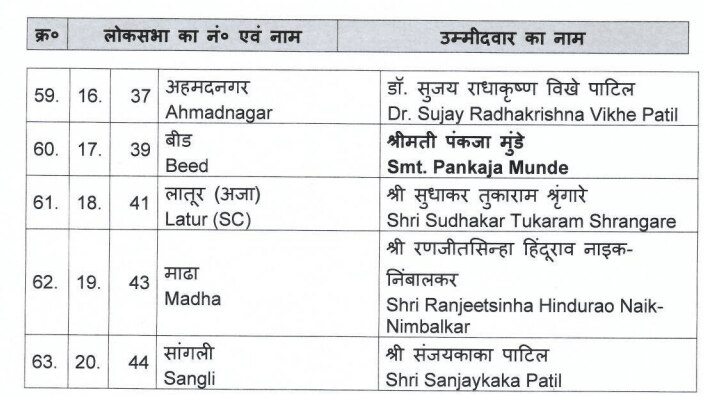 जालना सीट से बीजेपी ने रावसाहेब दानवे, डिंडोरी से भारती पवार, भिवंडी से कपिल मोरेश्वर पाटिल, मुंबई नॉर्थ ईस्ट से मिहिर कोटेचा, पुणे से मुरलीधर मोहोल, अहमदनगर (अहिल्यानगर) से सुजय राधाकृष्ण पाटिल, लातूर से सुधाकर तुकाराम शृंगारे, माढ़ा से रणजीतसिन्हा, सांगली से संजयकाका पाटिल को बीजेपी ने उम्मीदवार बनाया है. बता दें कि पंकजा मुंडे को महाराष्ट्र के बीड से बहन प्रीतम मुंडे (मौजूदा सांसद) की जगह कैंडिडेट बनाया गया है.