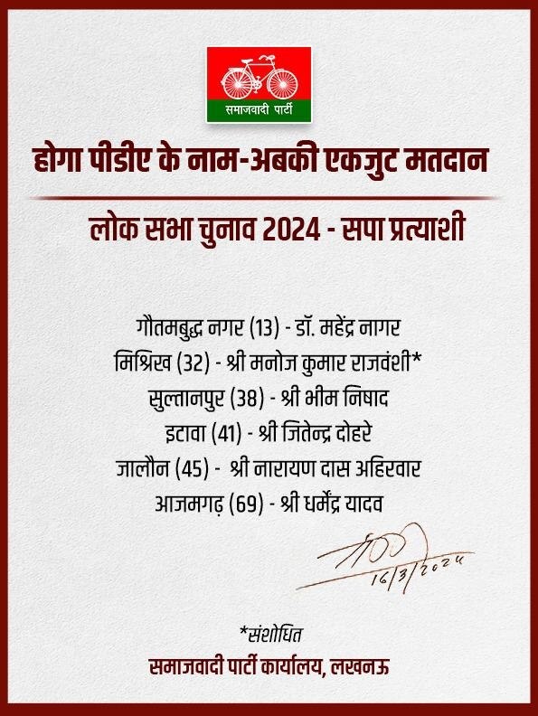समाजवादी पार्टी ने लोकसभा चुनाव के लिए 6 और उम्मीदवारों के नामों का ऐलान किया है. पार्टी ने मिश्रिख सीट से पार्टी उम्मीदवार को बदल लिया है और वहां से पहले पूर्व मंत्री रामपाल राजवंशी को कैंडिडेट घोषित किया था लेकिन अब उनकी जगह मनोज कुमार राजवंशी को टिकट दे दिया गया है. इसके अलावा आजमगढ़ से धर्मेंद्र यादव को टिकट दिया गया है.