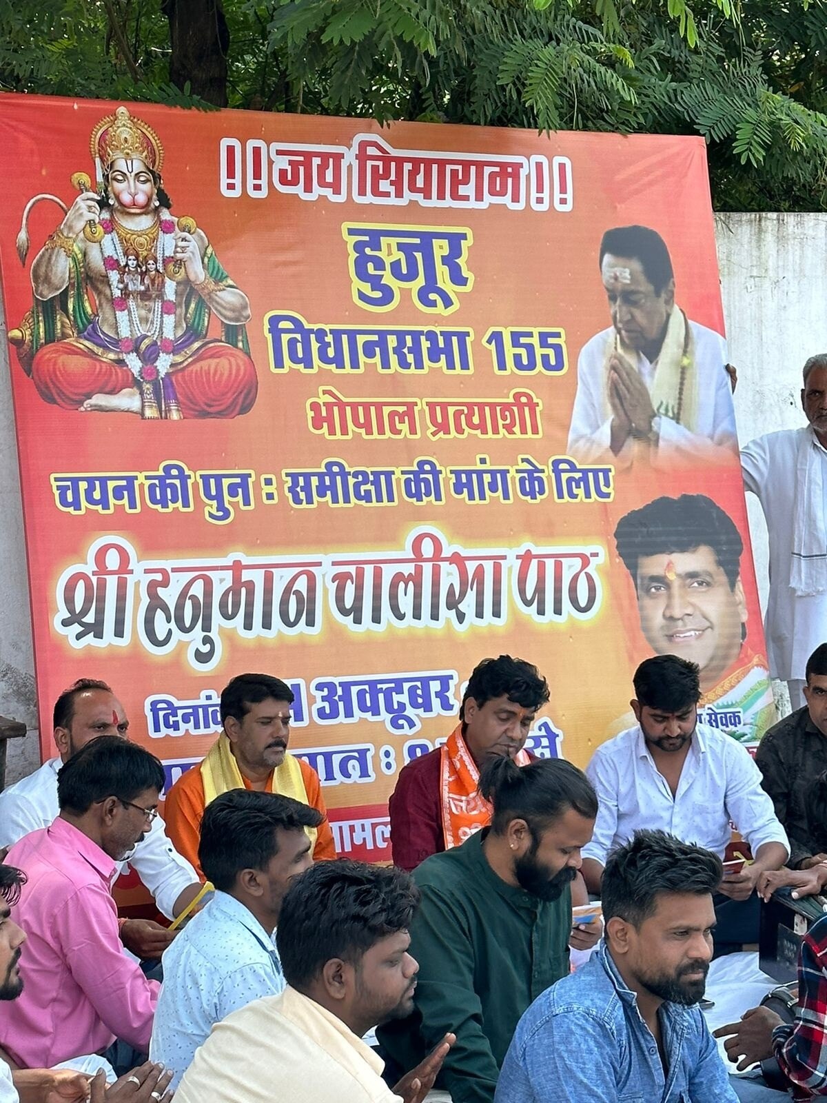 भोपाल की हुज़ूर विधानसभा से टिकट की दावेदारी कर रहे विष्णु विश्वकर्मा और उनके समर्थकों ने पूरी मंडली के साथ हनुमान चालीसा के पाठ का आयोजन कराया है. पूर्व मुख्यमंत्री कमलनाथ के बंगले के बाहर यह पूजा पाठ हो रहा है.