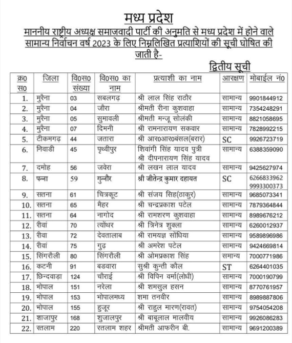 समाजवादी पार्टी की ओर से जारी लिस्ट के मुताबिक भोपाल की नरेला सीट से शमसुल हसन, भोपाल मध्य से शमा तनवीर, भोपाल की हुजूर सीट से राहुल मारण (रावत), छिंदवाड़ा की चौराई से विपिन वर्मा, कटनी के बडवारा से कुंती कौल, सिंगरौली से ओमप्रकाश सिंह, रीवा की त्योंथर से त्रिनेत्र शुक्ला, देवतालाब से रामयज्ञ सोंधिया, गुढ़ से अमरेश पटेल को टिकट दिया गया है.
