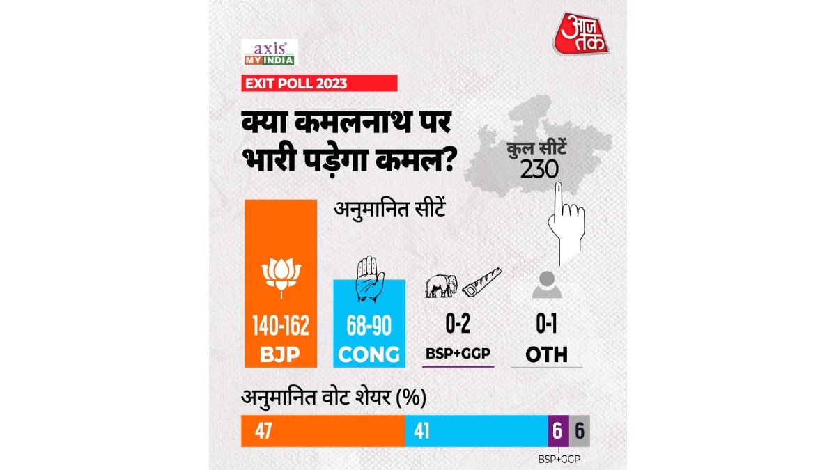 मध्य प्रदेश में कमल खिलेगा या कमलनाथ कमाल करेंगे, इसका फैसला 3 दिसंबर को मतगणना के दिन होगा. लेकिन इससे पहले आजतक-एक्सिस माई इंडिया के एग्जिट पोल के नतीजे सामने आ गए हैं. एग्जिट पोल में आंकड़ों के मुताबिक मध्य प्रदेश में बीजेपी प्रचंड बहुमत से वापसी करती हुई नजर आ रही है. एग्जिट पोल के अनुसार सूबे में बीजेपी को मध्य प्रदेश में 140 से 162 सीटें मिल सकती हैं, जबकि कांग्रेस को 68 से 90 सीटें मिलने का अनुमान है.