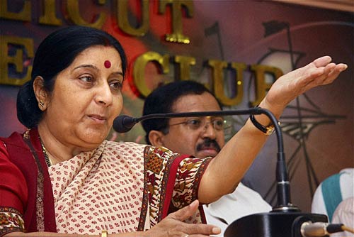 कोझिकोड में मीडियाकर्मियों के सवालों का जवाब देती भारतीय जनता पार्टी की वरिष्ठ नेता सुषमा स्वराज.