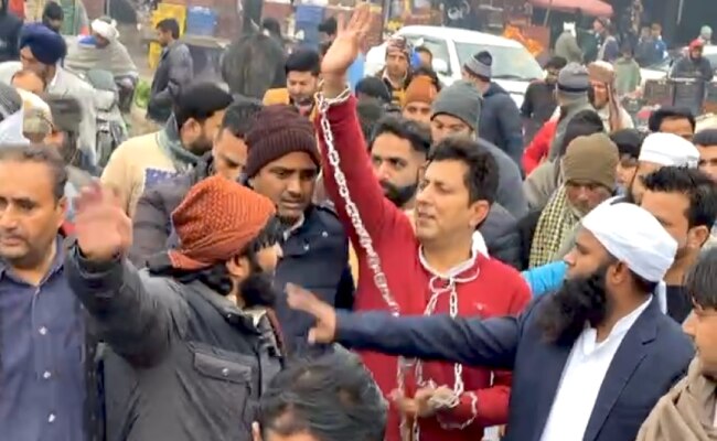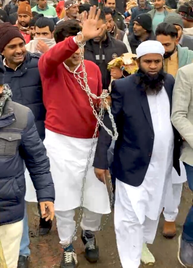 सफेद कपड़े पहने और जंजीरों में जकड़ कर चल रहे इस शख्स को ध्यान से देखिए. आपको लग रहा होगा कि कोई कुख्यात अपराधी होगा जिसको बेड़ियों में जकड़ कर लोग बाजार मैं जुलूस निकाल रहे हैं. लेकिन इसके पीछे देशभक्ति की धुन भी चल रही है. असल में, यह जनाब हैं साकिब अली उर्फ राजा.