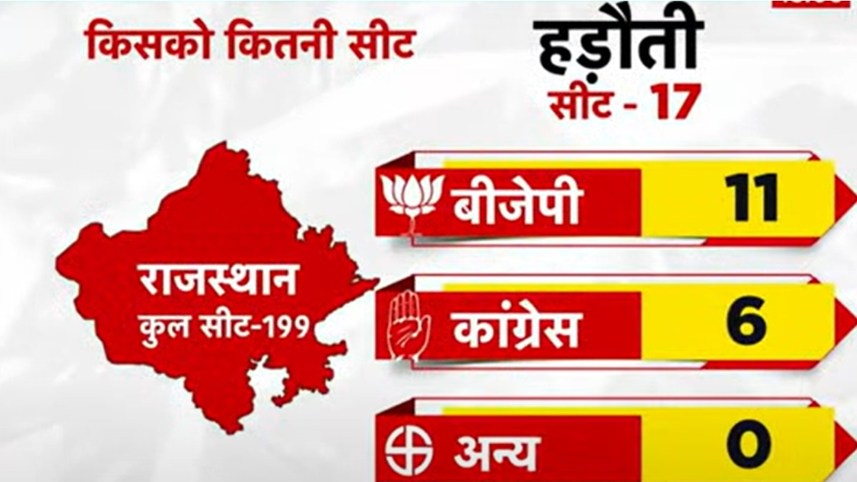 राजस्थान के हाड़ौती क्षेत्र में 17 सीटों पर वोटिंग हुई थी. एग्जिट पोल के मुताबिक यहां बीजेपी को 11 तो कांग्रेस को 6 सीटें मिल सकती हैं. यहां बीजेपी को 47 फीसदी वोट मिल सकते हैं, तो कांग्रेस को 44 फीसदी वोट मिलने का अनुमान है.