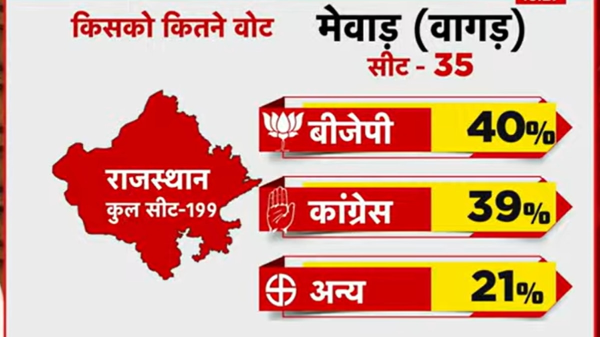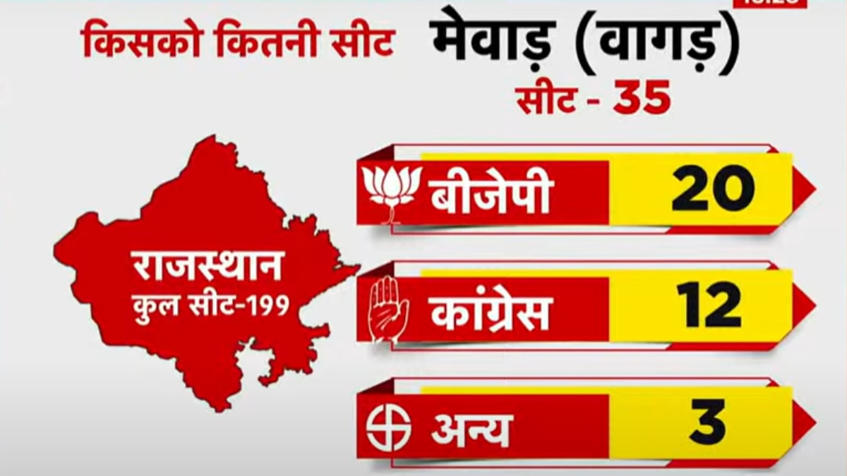 मेवाड़ (वागड़) इलाके में कांग्रेस को 12 तो बीजेपी को 20 सीटें मिलने का अनुमान है. यहां पिछली बार भी सीटों का आंकड़ा यही था. मतलब पिछले चुनाव में कांग्रेस ने इस क्षेत्र से 12 और बीजेपी ने 20 सीटें ही जीती थीं.