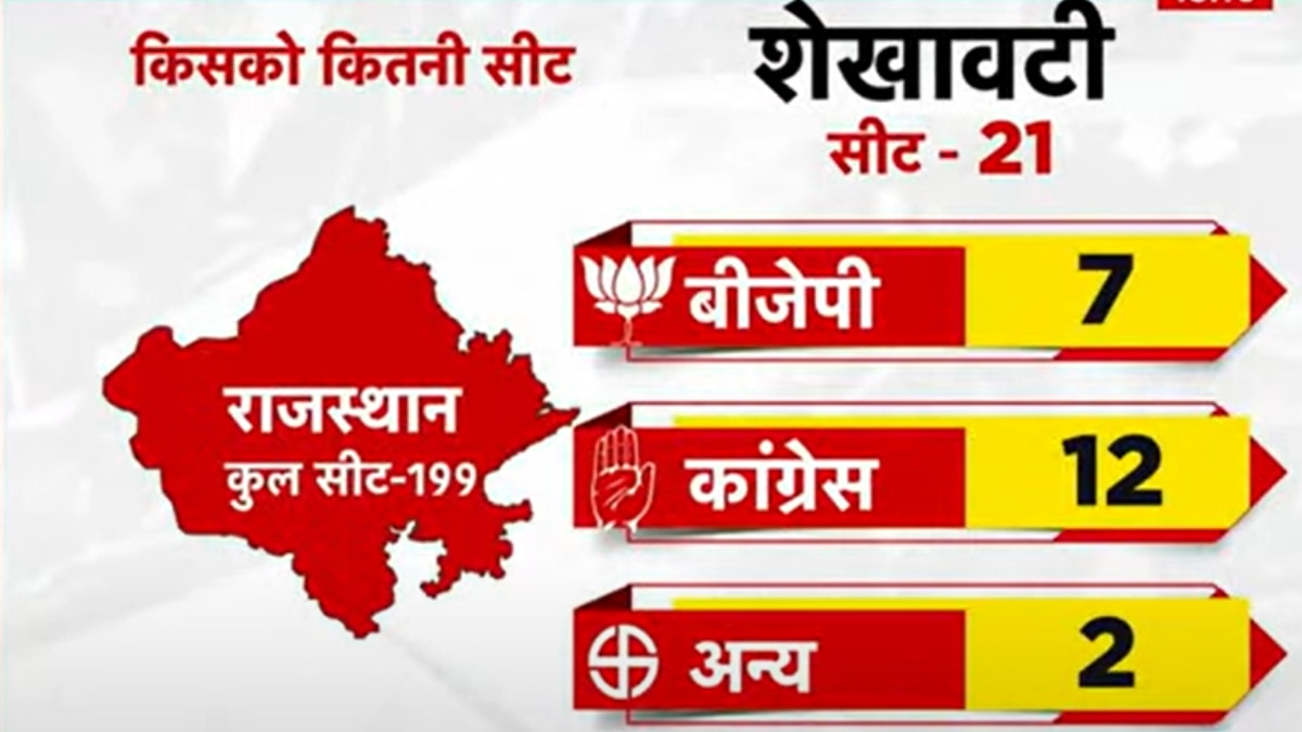 राजस्थान के शेखावटी क्षेत्र में 21 सीटों पर वोटिंग हुई थी. आजतक-एक्सिस माई इंडिया के एग्जिट पोल के मुताबिक यहां कांग्रेस को 12 सीटें तो बीजेपी को 7 सीटें मिलने का अनुमान है. शेखावटी में चुरू, झुंझुनू और सीकर शामिल है. पिछले चुनावों में यहां बीजेपी को 4 सीटों मिली थी, जबकि कांग्रेस को 15 सीटें मिली थीं.