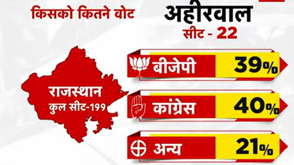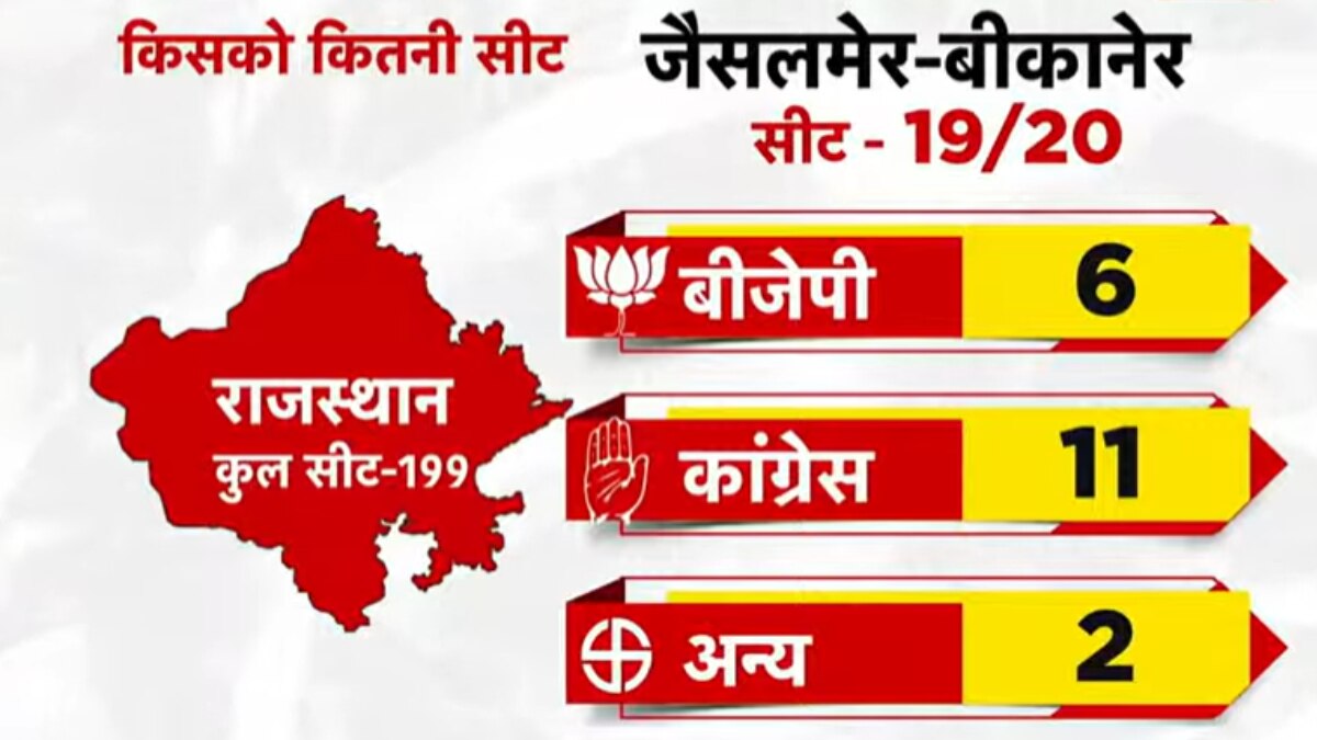 जैसलमेर-बीकानेर में बीजेपी को 39 फीसदी वोट तो कांग्रेस को 41 फीसदी वोट मिल सकते हैं. जबकि अन्य के खाते में 20 फीसदी वोट शेयर मिल सकता है. यहां कांग्रेस को 11 तो बीजेपी को 6 सीटें मिल सकती हैं.