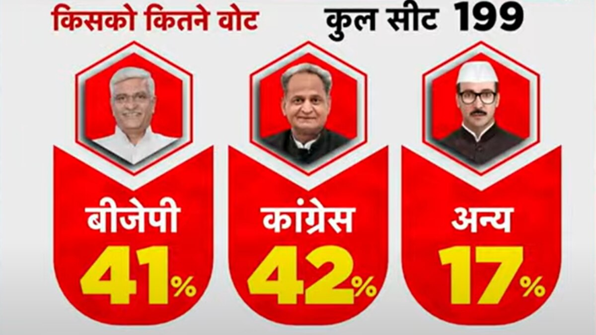 राजस्थान में 199 सीटों पर वोटिंग हुई थी. कांग्रेस प्रत्याशी के निधन के कारण श्रीगंगानगर जिले के करणपुर विधानसभा क्षेत्र में चुनाव स्थगित कर दिया गया था. 199 विधानसभा क्षेत्रों में कुल 5,25,38,105 वोटर्स में से 3,92,11,399 मतदाताओं ने वोट डाले. इसमें 1,88,27,294 महिलाएं, 2,03,83,757 पुरुष और 348 थर्ड जेंडर के वोटर्स थे. राजस्थान में कांग्रेस और बीजेपी के बीच सीधा मुकाबला है.