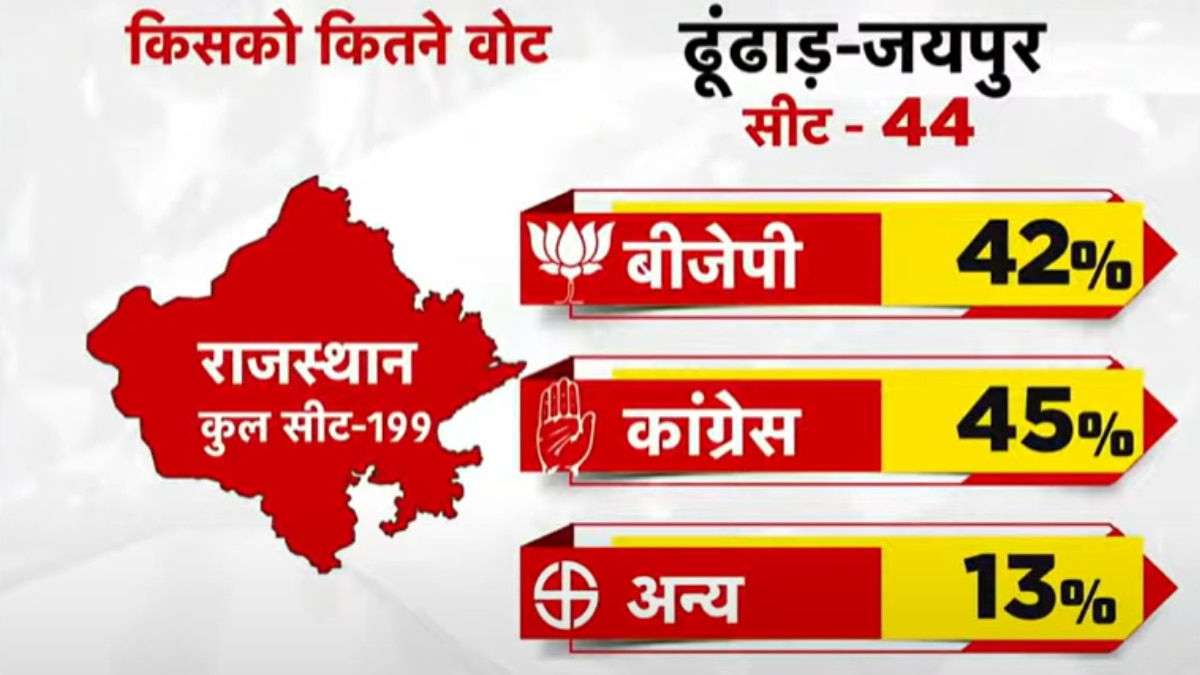 राजस्थान के ढूंढाड़-जयपुर कांग्रेस को 45 तो बीजेपी को 42 फीसदी वोट मिल सकते हैं. यहां कांग्रेस को 26 तो बीजेपी को 17 सीटें मिलने का अनुमान है. पिछले चुनाव में कांग्रेस को इस क्षेत्र में 25 सीटें मिली थीं, मतलब कांग्रेस ने एक सीट पर बढ़त बनाई है, जबकि बीजेपी को पिछली बार 12 सीटें मिली थीं. इस बार बीजेपी 5 सीटों की बढ़त बनाती हुई दिख रही है.