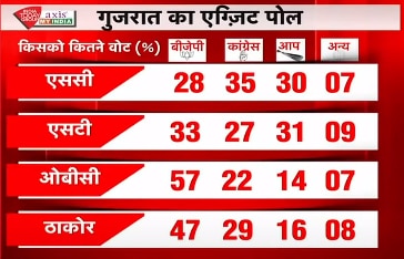 गुजरात विधानसभा चुनावों में 28% SC, 33% ST तो 57% OBC और 47 फीसदी ठाकोर वोटर्स ने भाजपा को वोट दिया. इसके अलावा कांग्रेस को 35% SC, 27% ST, 22% OBC और 29% ठाकोर वोट मिलने का अनुमान है. इसके अलावा आप को 30% SC, 31% ST, 14% OBC और 16 फीसदी ठाकोर वोट मिलने का अनुमान है.