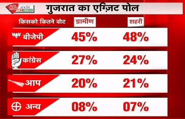 एग्जिट पोल के अनुसार गुजरात में 45 फीसदी ग्रामीणो ने भाजपा को वोट दिया है तो 48 फीसदी शहरी वोटर्स ने भाजपा पर भरोसा जताया है. वहीं कांग्रेस को 27 फीसदी ग्रामीणों और 24 फीसदी शहरी लोगों ने वोट दिया है. इसके अलावा AAP को 20% ग्रामीण और 21 फीसदी शहरी वोटर्स ने वोट दिया है. साथ ही 8 फीसदी ग्रामीणों ने अन्य दलों पर भरोसा जताया तो 7 फीसदी शहरियों ने अन्य दलों को वोट किया.