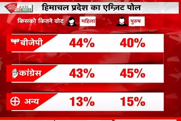इंडिया टुडे एक्सिस माई इंडिया के मुताबिक हिमाचल प्रदेश में 44 फीसदी महिलाओं ने भाजपा को वोट किया है. तो वहीं 40 फीसदी पुरुषों ने भाजपा को वोट किया है. इसके अलावा इन चुनावों में कांग्रेस भी कड़ी टक्कर देती नजर आ रही है. 43 फीसदी महिलाओं ने कांग्रेस को वोट दिया है तो 45 फीसदी पुरुषों ने कांग्रेस पर भरोसा जताया. इसके अलावा 13 फीसदी महिलाएं और 15 फीसदी पुरुषों ने अन्य दलों को वोट किया है.