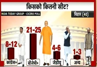 इंडिया टुडे ग्रुप और सीआईसीईआरओ ग्रुप के पोस्ट पोल सर्वे के मुताबिक बिहार की 40 सीटों में से बीजेपी को 21 से 25, यूपीए को 8 से 12, जेडीयू को 4 से 6 और अन्य को 1 से 3 सीटें मिलने का अनुमान है.