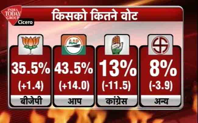 अगर वोट फीसदी की बात करें तो आम आदमी पार्टी (AAP) को सबसे ज्यादा 43.5 फीसदी वोट मिलने का अनुमान है. पिछले चुनाव के मुकाबले उसे 14 फीसदी का फायदा होता दिख रहा है. बीजेपी के वोट फीसदी में मामूली सुधार है. उसे 35.5 फीसदी वोट मिलने के आसार हैं जो पिछली बार के मुकाबले 1.4 फीसदी ज्यादा हैं. सबसे ज्यादा 11.5 फीसदी नुकसान कांग्रेस को हो रहा है. उसे सिर्फ 13 फीसदी वोट मिलने के आसार हैं. साफ है कि कांग्रेस के हिस्से के वोट टूटकर AAP के पक्ष में आते दिख रहे हैं.