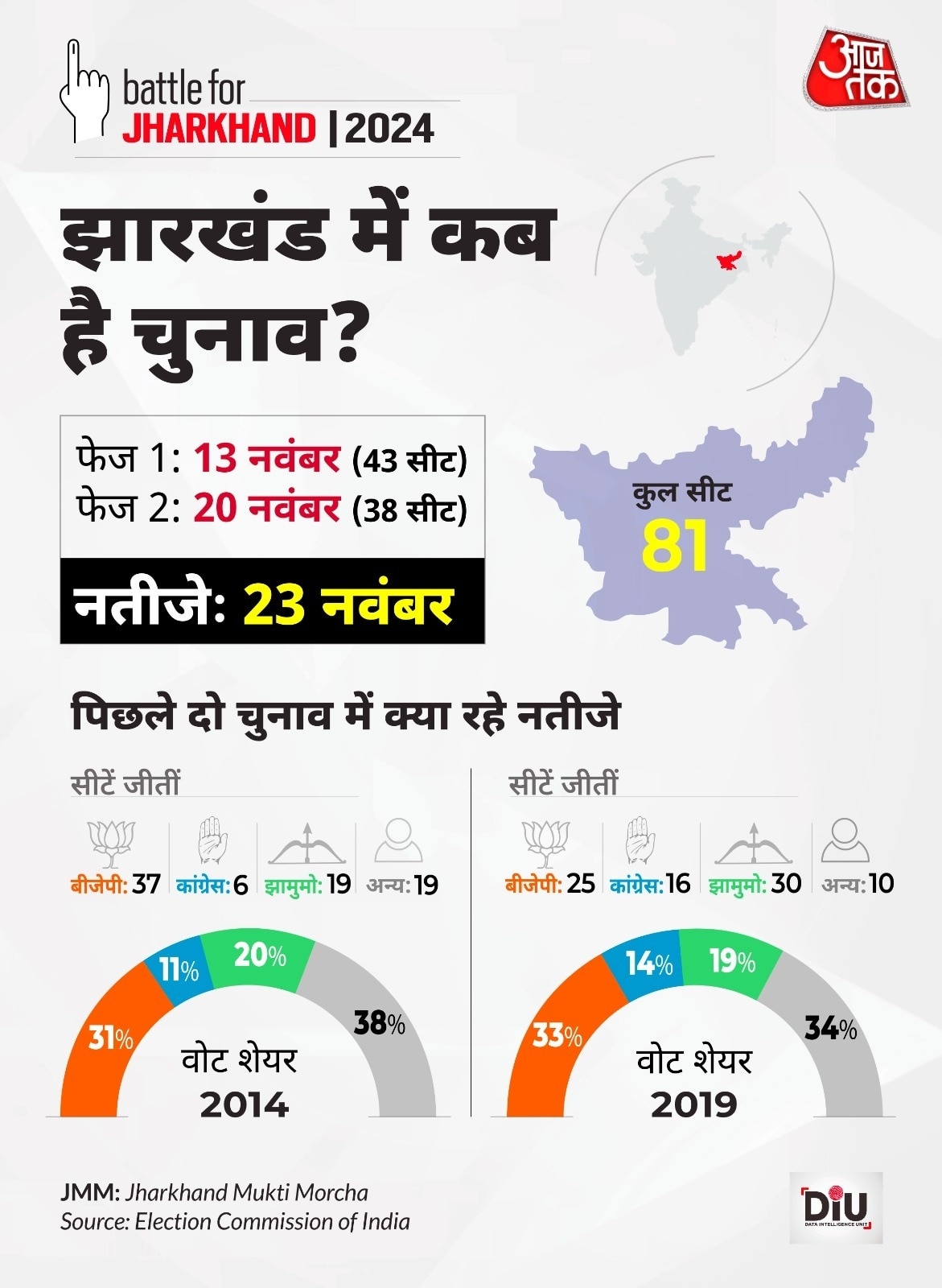 छोटा नागपुर के पठार पर जंगलों से आच्छादित झारखंड में विधानसभा की कुल 81 सीटों के लिए चुनाव होने हैं. विधानसभा चुनाव में पूर्ण बहुमत के साथ सरकार बनाने के लिए जादुई आंकड़ा 42 सीटों का है. पिछले यानि 2019 के विधानसभा चुनाव की बात करें तो 30 सीटें जीतकर जेएमएम सबसे बड़ी पार्टी के रूप में उभरी थी.