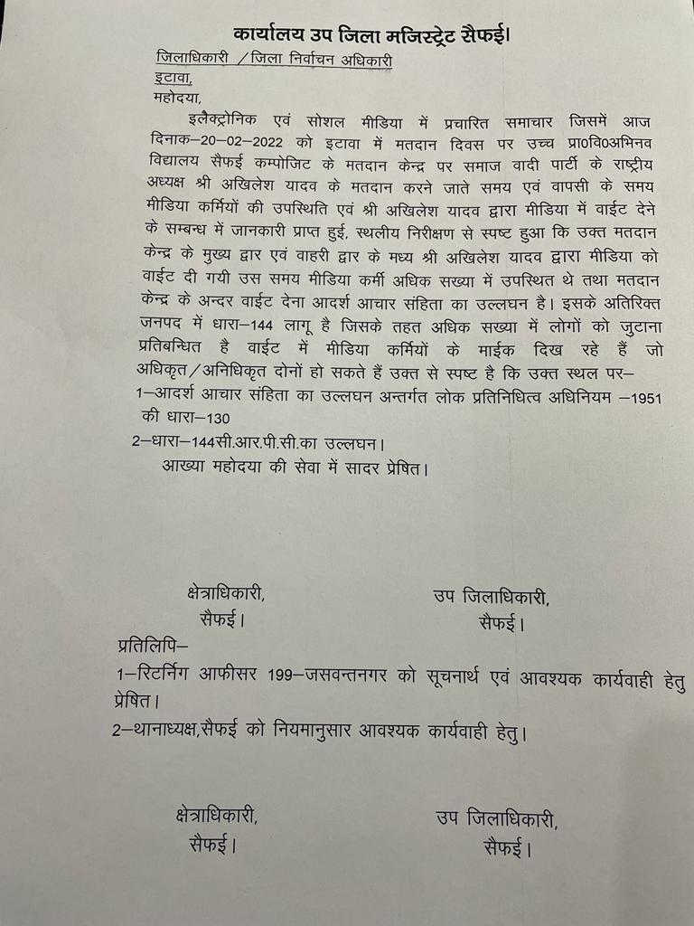सैफई के उप जिला मजिस्ट्रेट की ओर से कहा गया है कि इलेक्ट्रॉनिक और सोशल मीडिया में प्रचारित समाचार में अखिलेश यादव के वोट देने जाते और वोट देकर आते समय मीडियाकर्मियों से बात करने की जानकारी मिली. स्थलीय निरीक्षण से ये साफ हो गया कि अखिलेश यादव ने मतदान केंद्र के मुख्य द्वार और बाहर के द्वार के बीच में मीडिया से बात की है.