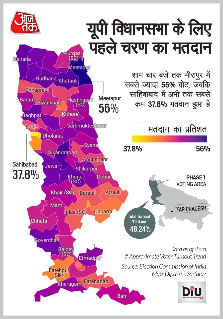 6: 34 PM: शाम 6 बजे तक पहले चरण के मतदान में 60.17% मतदान हुआ. सबसे ज्यादा मतदान कैराना (75.12) में और सबसे कम साहिबाबाद (45%) में हुआ है. आज यूपी में 11 जिलों की 58 विधानसभा सीटों के लिए मतदान हुआ.
