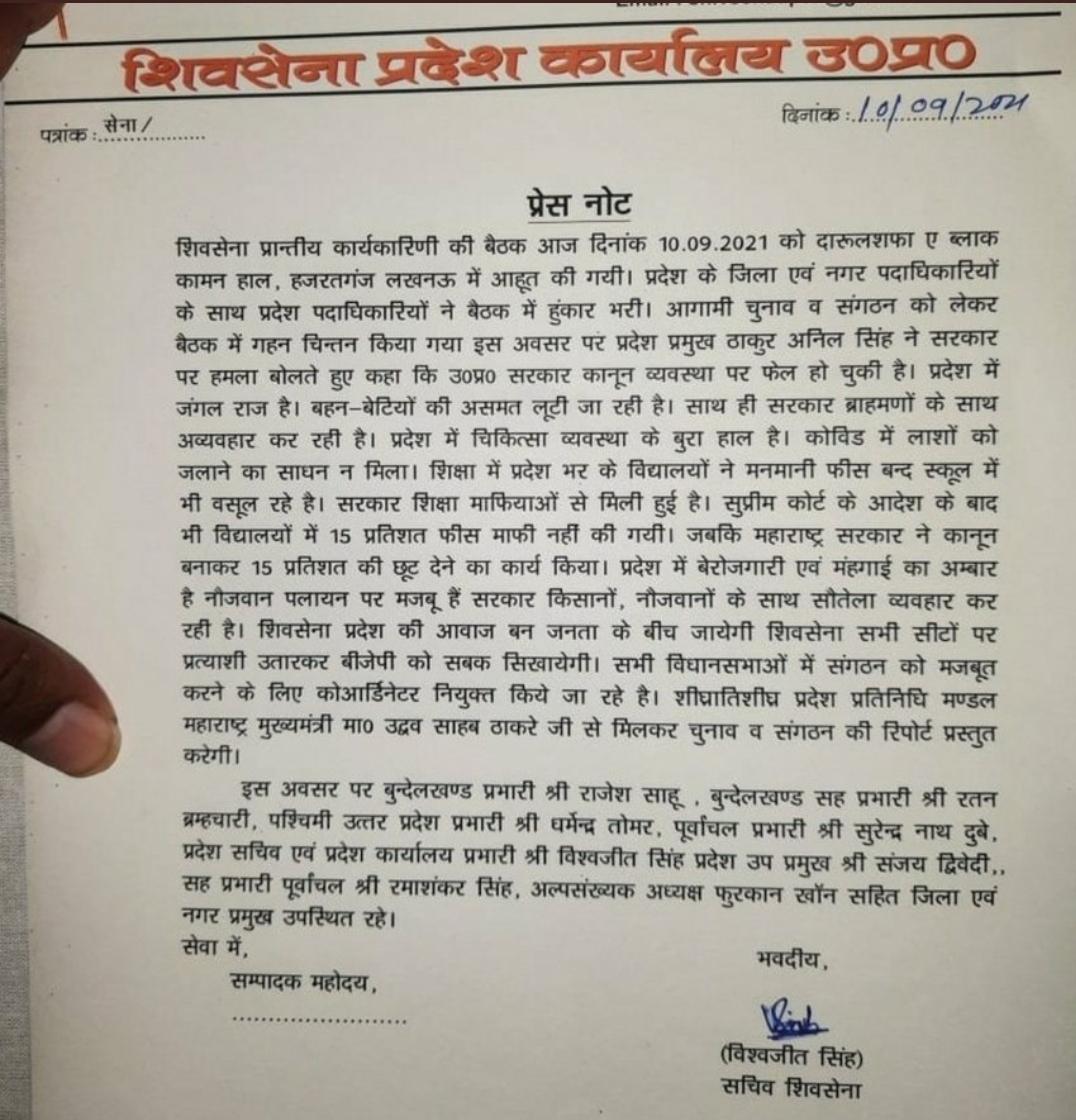बैठक के बाद शिवसेना ने एक प्रेस रिलीज जारी कर कहा, 'प्रदेश में जंगल राज है. चिकित्सा व्यवस्था का बुरा हाल है. स्कूल मनमानी फीस वसूल रहे है. सुप्रीम कोर्ट के आदेश के बाद भी स्कूलों में 15% फीस माफ नहीं हुई. बेरोजगारी और महंगाई का अंबार है. नौजवान पलायन कर रहे हैं. किसानों, ब्राह्मणों के साथ दुर्व्यवहार हो रहा है. शिवसेना प्रदेश की आवाज बन जनता के बीच जाएगी और सभी सीटों पर अपने प्रत्याशी उतारकर बीजेपी को सबक सिखाएगी.'