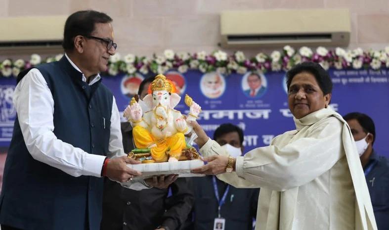 लखनऊ में बसपा के ब्राह्मण सम्मेलन के समापन पर मायावती का मंच पूरी तरह हिंदुत्व की रंग में रंगा नजर आया. ब्राह्मण शंख बजे रहे थे, मंत्रोच्चार हो रहा था और मायावती हाथों में त्रिशूल लिए देवी की तरह लहरा रही थी. वो भगवान गणेश की प्रतिमा भी लिए नजर आईं. मायावती का रणनीति साफ है. हिंदुत्व की हवा में बहकर बीजेपी के पक्ष में जा रहे अधिक से अधिक वोटों को हाथी के पक्ष में मोड़ना.