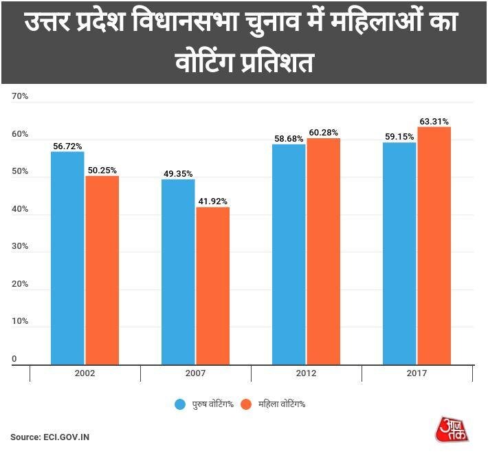 उत्तर प्रदेश चुनाव के आंकड़े बताते हैं कि वोटिंग में महिलाओं की भागीदारी बढ़ने लगी है. 2002 के विधानसभा चुनाव हुए तो उस चुनाव में 50 फीसदी महिलाओं ने वोट डाले. वहीं, पुरुषों का वोटिंग प्रतिशत 57 के आसपास रहा था. आखिरी बार 2017 में विधानसभा चुनाव हुए तो महिलाओं का वोटिंग प्रतिशत पुरुषों से ज्यादा रहा. 2017 में करीब 60 फीसदी पुरुष और 63 फीसदी से ज्यादा महिलाओं ने वोट दिया.