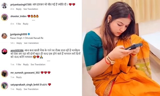 एक यूजर ने लिखा, 'पवन भैया के गानों का सही इस्तेमाल आप करती हैं.' एक अन्य यूजर ने लिखा, 'आजकल आप सिर्फ पवन सिंह के गानों पर रील डाल रही हो भाभी, लगता है जल्दी ठीक होने वाला है.' वहीं दूसरे यूजर ने कमेंट किया,'आप हारकर भी जीत गई हैं ज्योति दी.'