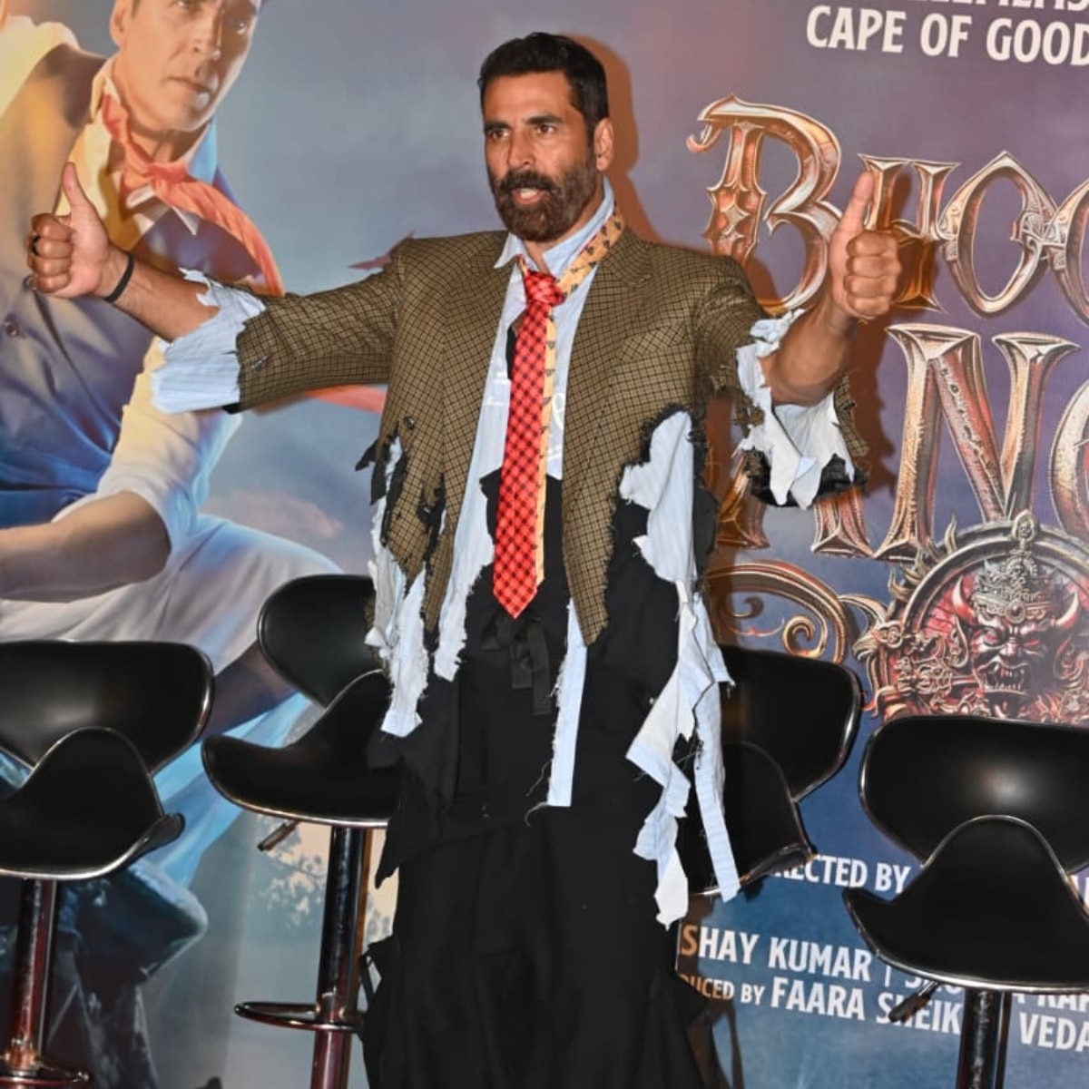 अक्षय ने कटी-फटी सी ब्राउन ब्लेजर के साथ चिथड़े उड़ी हुई व्हाइट शर्ट मैच की थी. वहीं इसके साथ एक्टर ने ढीली-ढाली फ्रिल्स वाली ब्लैक पैंट पहनी थी. अक्षय कुल मिलाकर अपनी फिल्म की कहानी जताते नजर आए. उनका लुक बिल्कुल वैसा है जैसे किसी फिल्म में हीरो पहले हाफ में कॉमेडियन हो और सेकंड हाफ में भूतों का बाप निकल जाए.