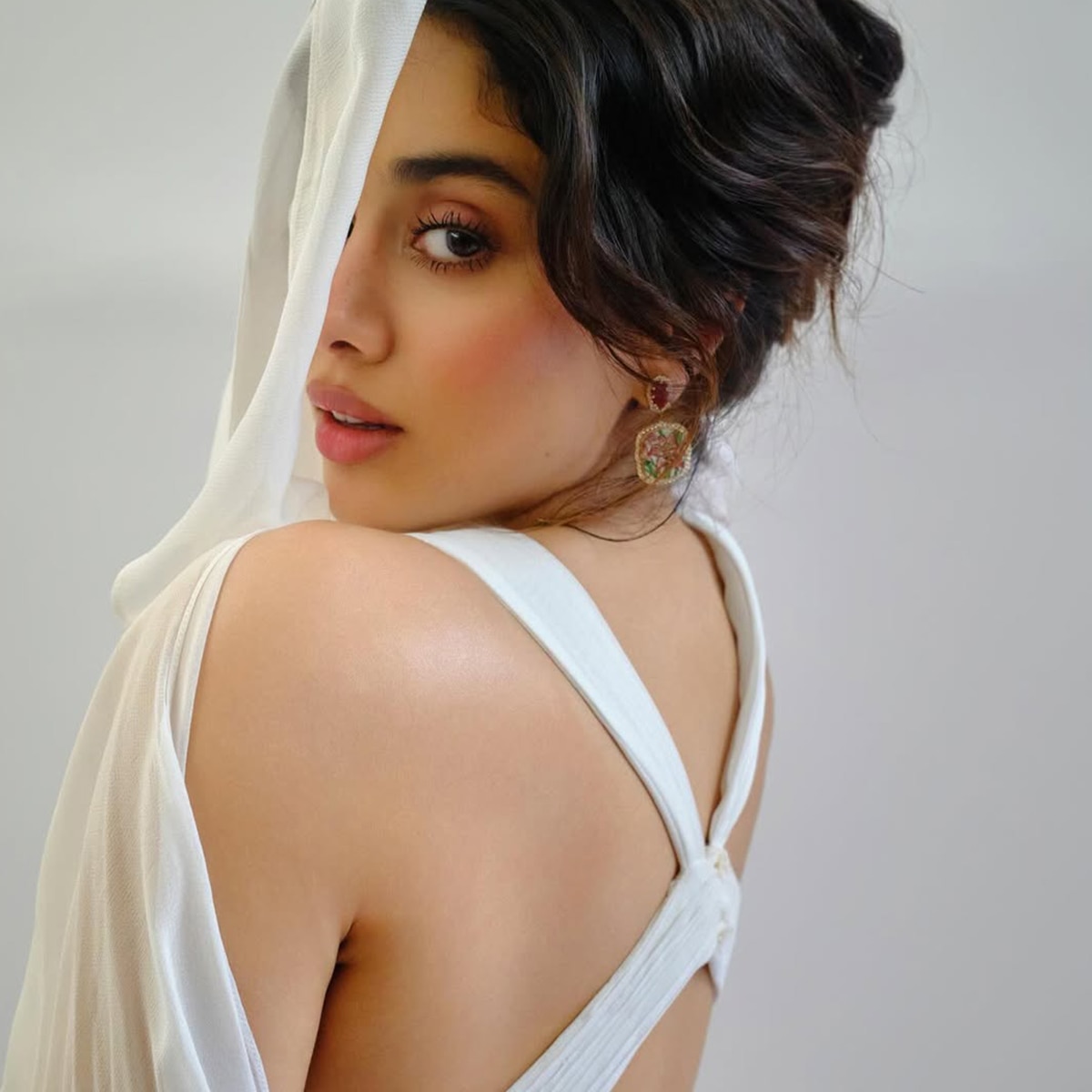 जाह्नवी व्हाइट फ्लोई बैकलेस ड्रेस में कहर ढाती दिखीं. उन्होंने स्टेटमेंट ईयररिंग्स कैरी करके अपना लुक कंप्लीट किया. बालों में उन्होंने मेसी बन बनाया.