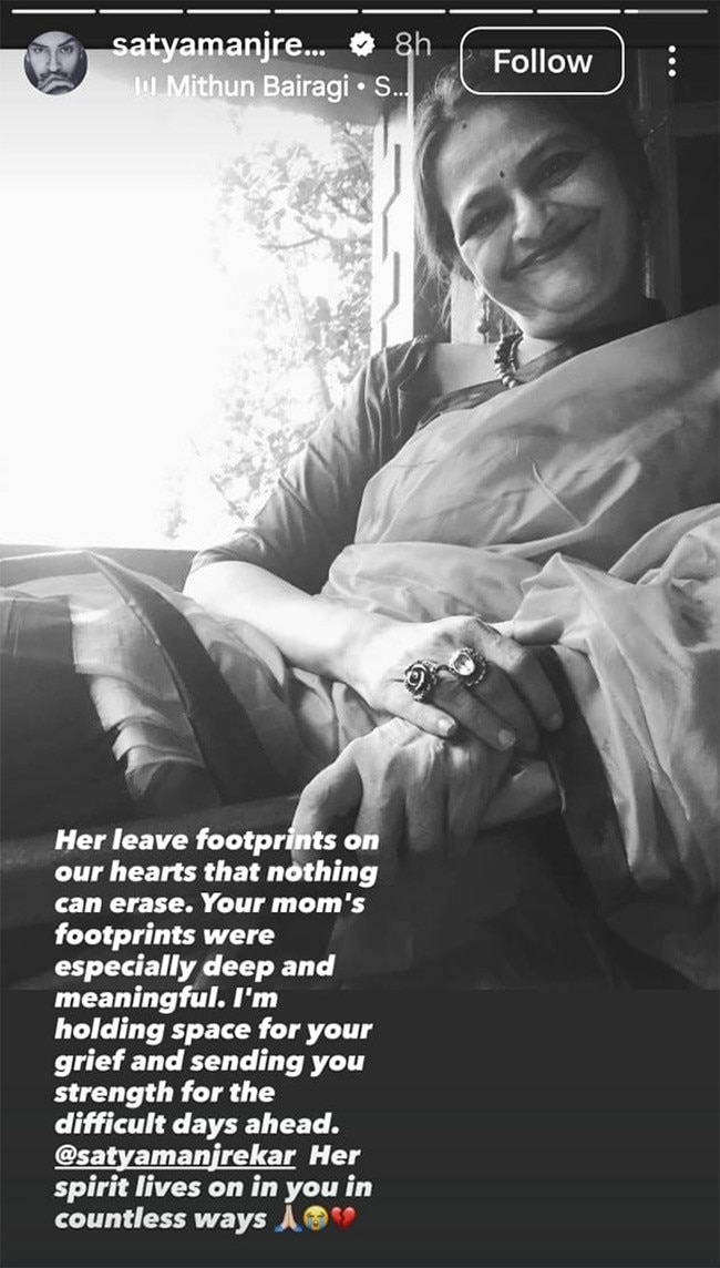 सत्या मांजरेकर ने अपनी मां की पुरानी फोटो को शेयर करते हुए इंस्टाग्राम स्टोरी पर लिखा, 'मां, मुझे आपकी बहुत याद आती है.' इस इमोशनल नोट के बाद सत्या के दोस्तों ने उन्हें सांत्वना दी और दीपा को श्रद्धांजलि दी.