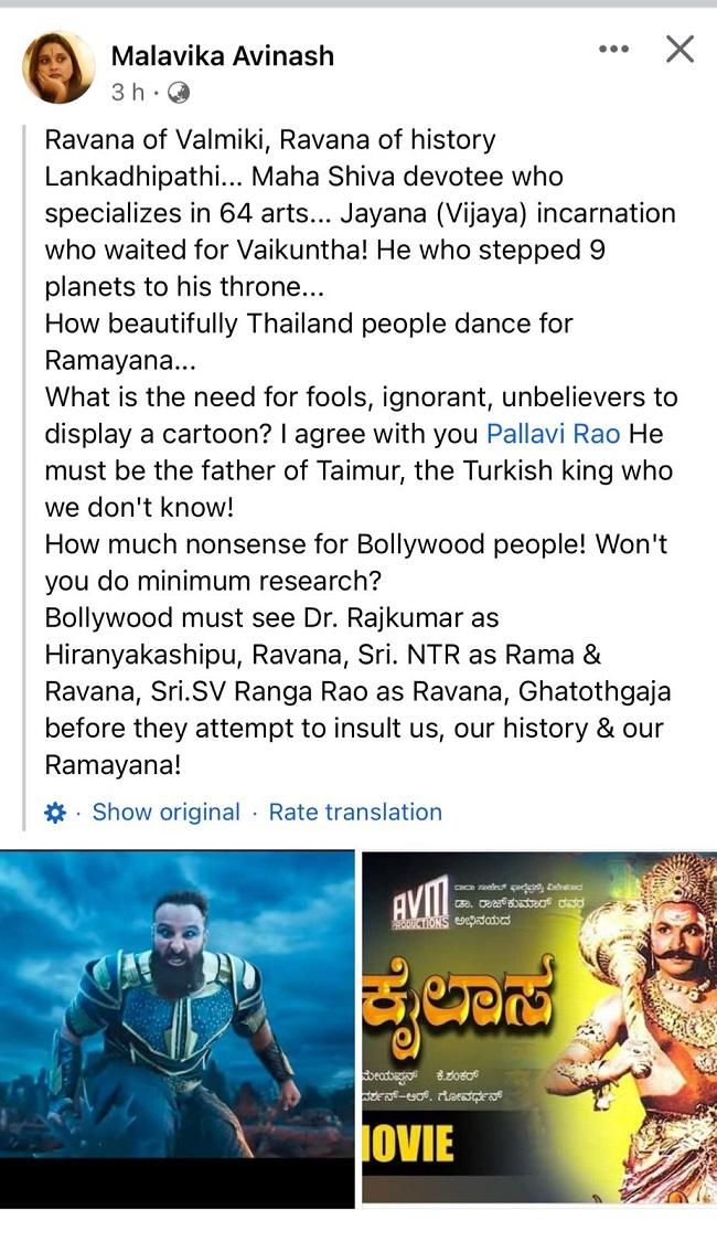 इसके अलावा बीजेपी की प्रवक्ता और मालविका ने भी आदिपुरुष के बारे में बात की है. उन्होंने फेसबुक पर पोस्ट लिखा, 'वाल्मीकि के रावण, इतिहास के रावण, लंकाधिपति, महाशिव के भक्त जो 64 कलाओं में माहिर थे. जिन्होंने 9 ग्रहों को अपने सिहांसन में जड़वाया था. थाईलैंड के लोग कितनी खूबसूरती से रामायण के लिए नाचते हैं. तो फिर इस कार्टून को बनाने की क्या जरूरत थी. मैं मानती हूं कि ये सही में तैमूर का पिता है. बॉलीवुड के लोग कितने बेवकूफ हैं. थोड़ी सी रिसर्च भी नहीं कर सकते.'