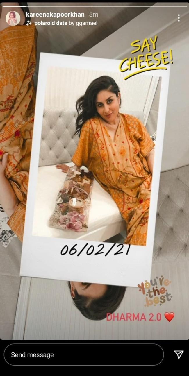 इस फोटो में वह यलो कलर का कफ्तान पहने बैठी हैं और उनके आगे गुडीज का एक पैकेज रखा हुआ है. इस फोटो के कैप्शन में करीना ने लिखा, ''बोलो चीज'' और ''धर्मा 2.0'' किया है. माना जा रहा है कि यह गुडीज करीना को करण जौहर की तरफ से मिले हैं. हालांकि इस बारे में करीना ने खुद कुछ नहीं बताया है.