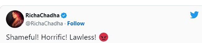 एक्ट्रेस रिचा चड्ढा को भी इस घटना ने शॉक्ड कर दिया है. वो लिखती हैं-  शर्मनाक! भयानक! अधर्म!