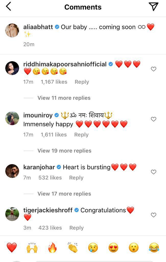 आलिया भट्ट की प्रेग्नेंसी से करण जौहर कितने ज्यादा हैप्पी और एक्साइटेड हैं, इसका अंदाजा आप उनके रिएक्शन से लगा सकते हैं. करण ने आलिया की पोस्ट पर कमेंट कर अपनी एक्साइटमेंट जगजाहिर की है. करण जौहर ने लिखा- हार्ट इज बर्स्टिंग. इसके साथ उन्होंने कई सारी हार्ट इमोजी भी शेयर की हैं. करण के अलावा रणबीर कपूर की बहन रिद्धिमा कपूर ने भी हार्ट इमोजी के साथ अपने भाई-भाभी पर प्यार लुटाया है. मौनी रॉय टाइगर श्रॉफ समेत तमाम सेलेब्स और फैंस आलिया और रणबीर को इस खुशी के मौके पर ढेर सारा प्यार और बधाइयां दे रहे हैं.